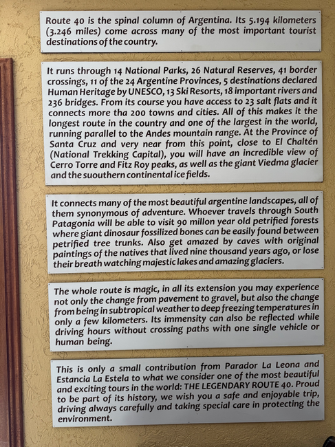 Friday morning was pretty casual -- shower, eat breakfast, take out the trash, and then out to the road for the bus! The bus to Calafate was smooth and absolutely stunning. Clear skis & lots of guanacos out and about. We made a quick bathroom stop at the same hotel we stopped by on the way in and I got to read a bit more about Route 40, the major highway that runs north to south through Argentina (some cool details below). The Calafate airport on the other hand... an absolute nightmare. Apparently there had a been a country-wide transportation strike the day prior, so we arrived to a chaotic scene. Though we'd arrived 3 hours early, we ended up being in line for probably 2 of those hours just to check our bags. When I landed here at the start of the trip, there were about 5 people in the entire airport, so seeing hundreds of people waiting was surprising. We eventually got the bags checked and then only had a short wait until boarding. I slept a lot on the flight, reading Lonesome Dove during my few waking moments, so before I knew it we were landing in Buenos Aires for our 3 days in the city at Paulo's!